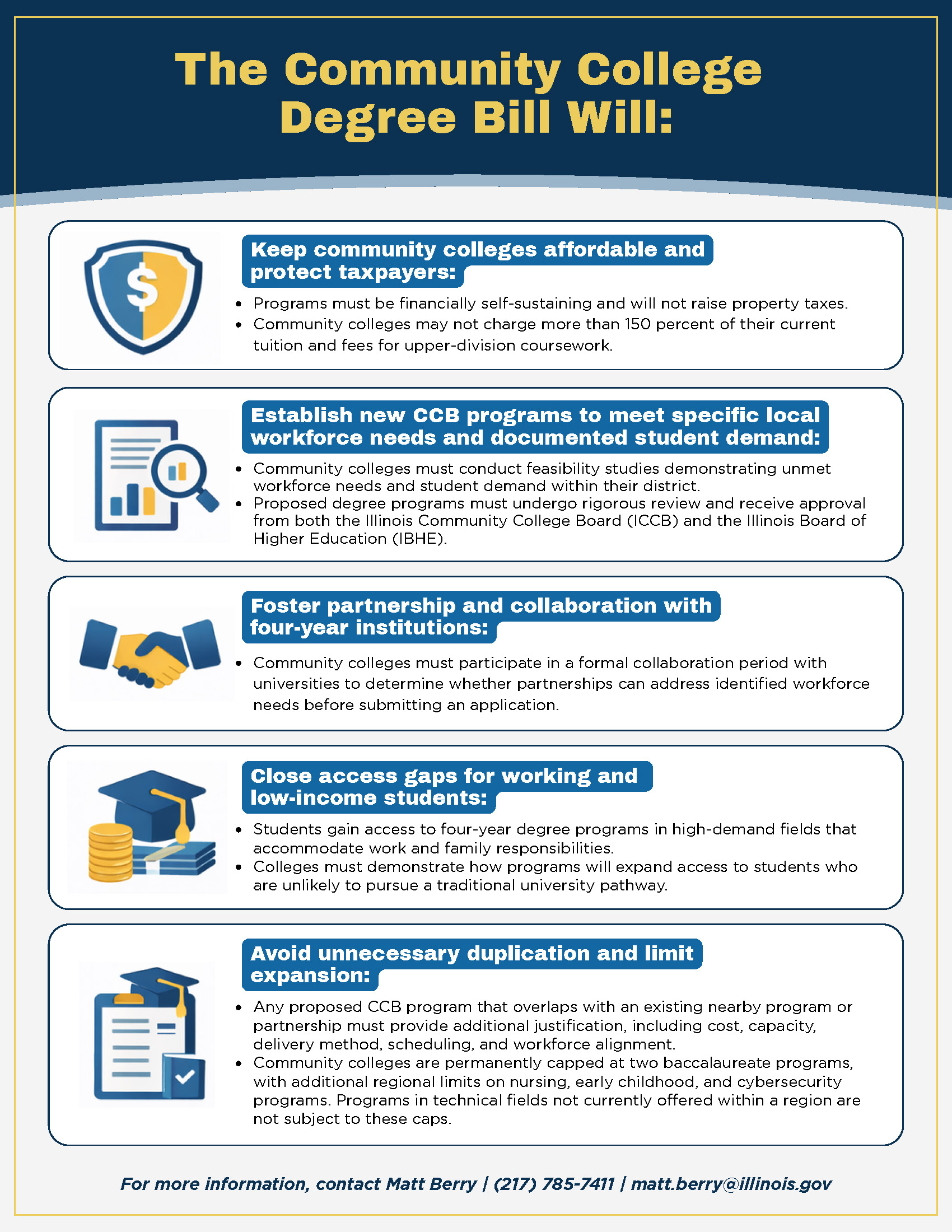 “Community colleges are already embedded in the communities they serve. They understand their students, their employers, and their local workforce needs. Allowing targeted bachelor’s degrees builds on that foundation and ensures students can complete their education close to home,” said Jim Reed, Executive Director of the Illinois Community College Trustees Association.
