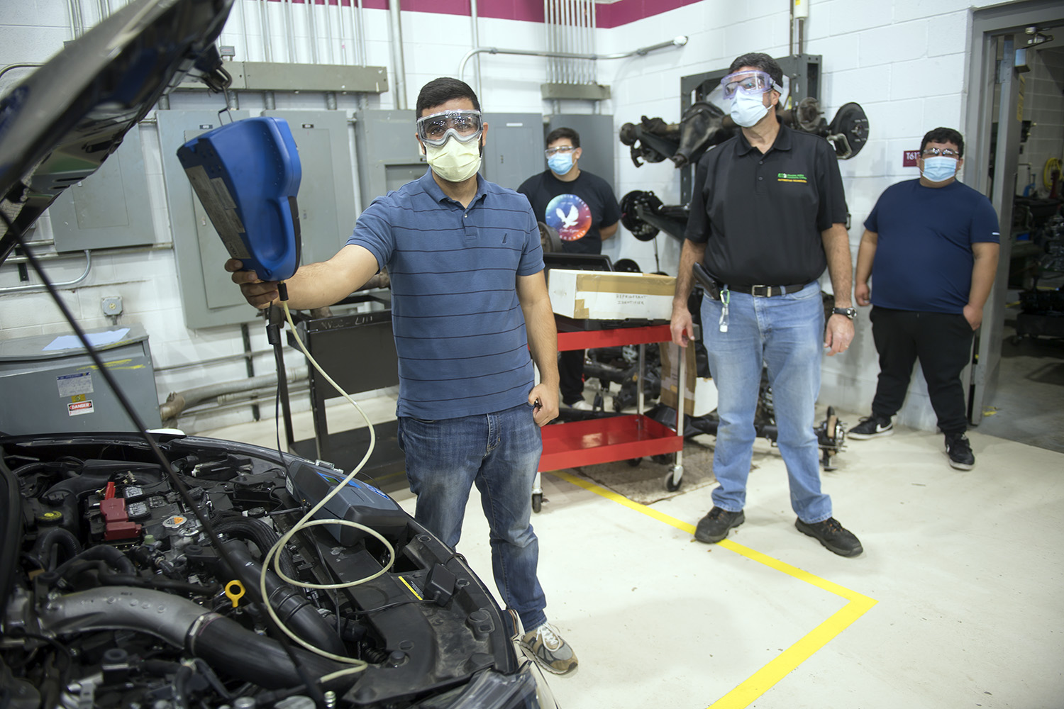 Automotive technology classes typically involve in-person instruction with two hours of lecture and four hours of lab work one day per week. Lectures and homework were put online, and students only came to campus, in smaller numbers, to complete lab assignments.